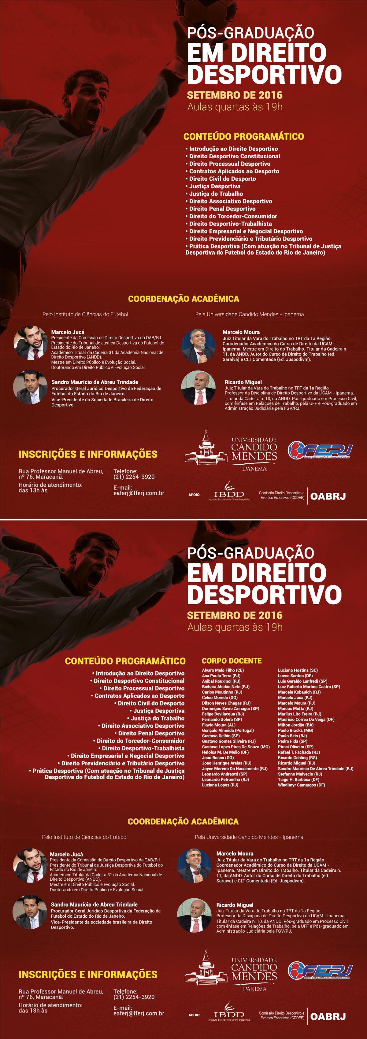 Local das aulas: Universidade Cândido Mendes (Campus Ipanema), salvo as atividades de prática que acontecerão na Federação de Futebol do Estado do Rio de Janeiro (FERJ).